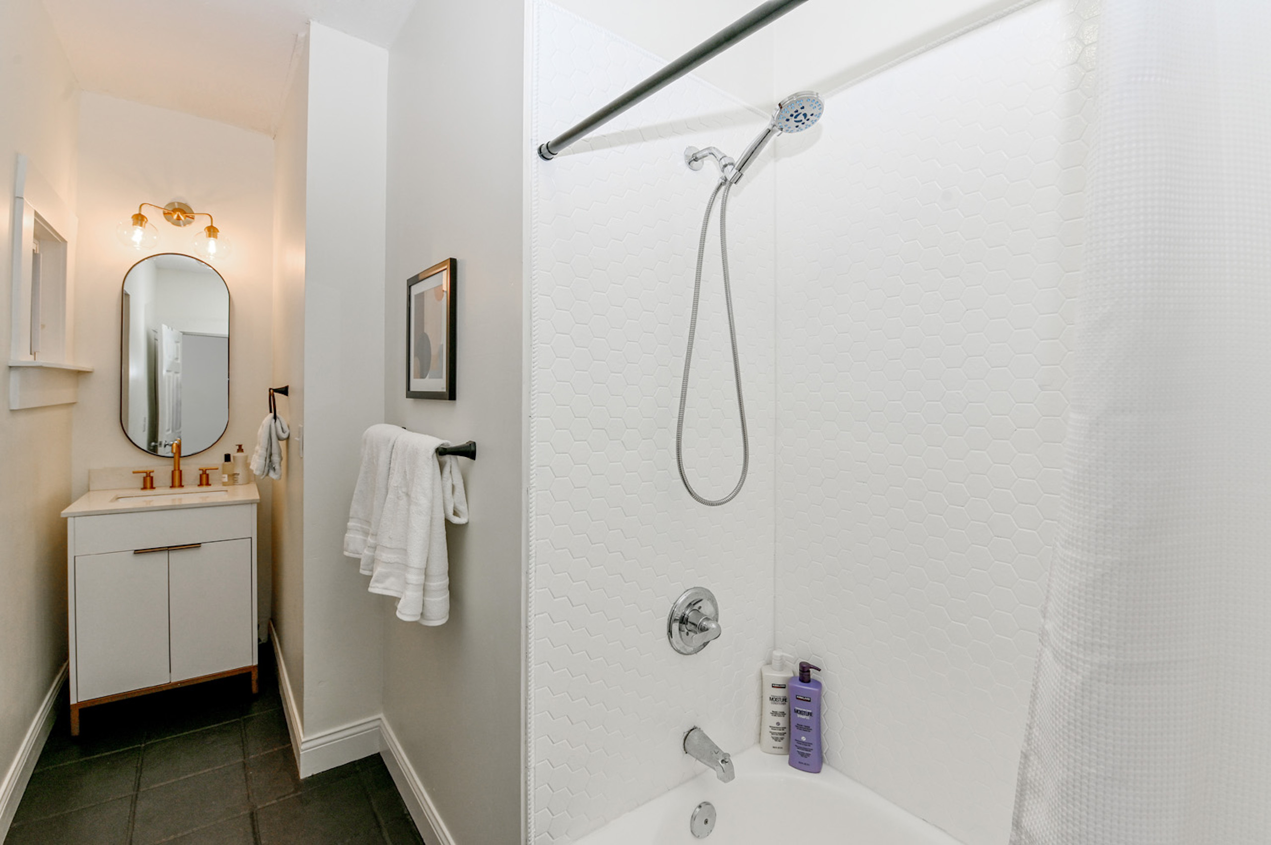 Head upstairs where you will find 3 bedrooms, each with their own unique design sensibilities, with enough room to sleep 8 comfortably, and a full bath with newly installed cabinetry.